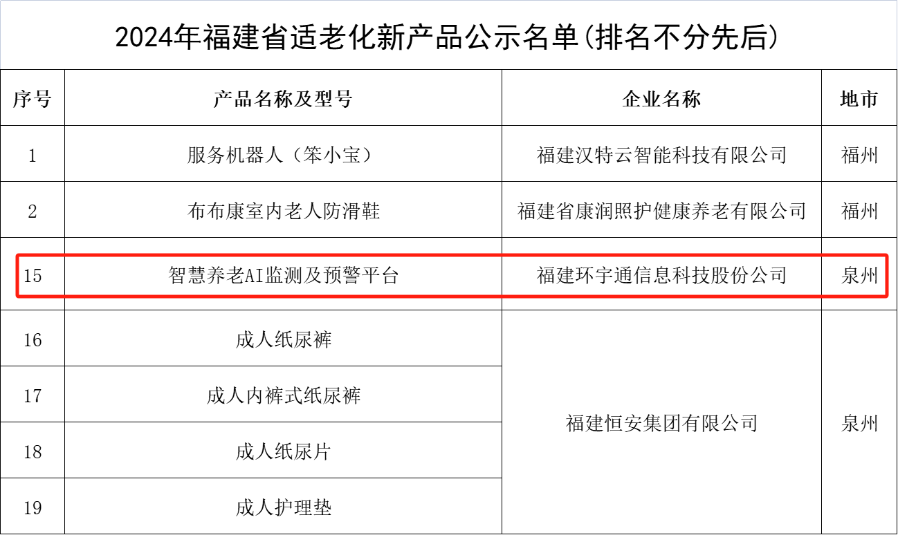 2024年11月19日,2024年福建省适老化新产品公示名单公布,全省有24款产品位列名单,泉州共有五款产品入选。其中888集团依托技术积累和创新能力所推出的“智慧养老AI监测及预警平台”入选该名单。这一荣誉不仅是对公司在“AI+医疗康养”领域的长期努力和贡献的肯定,更是对未来持续创新与高质量开展的激励。